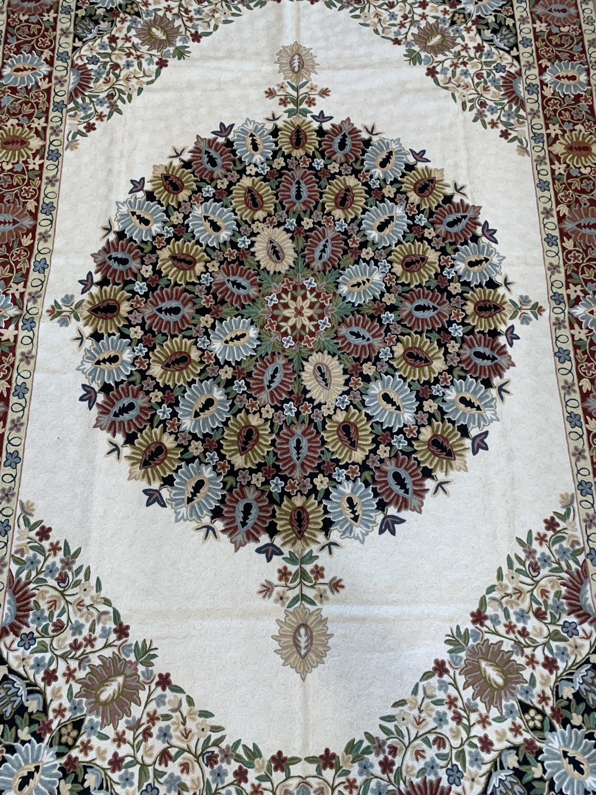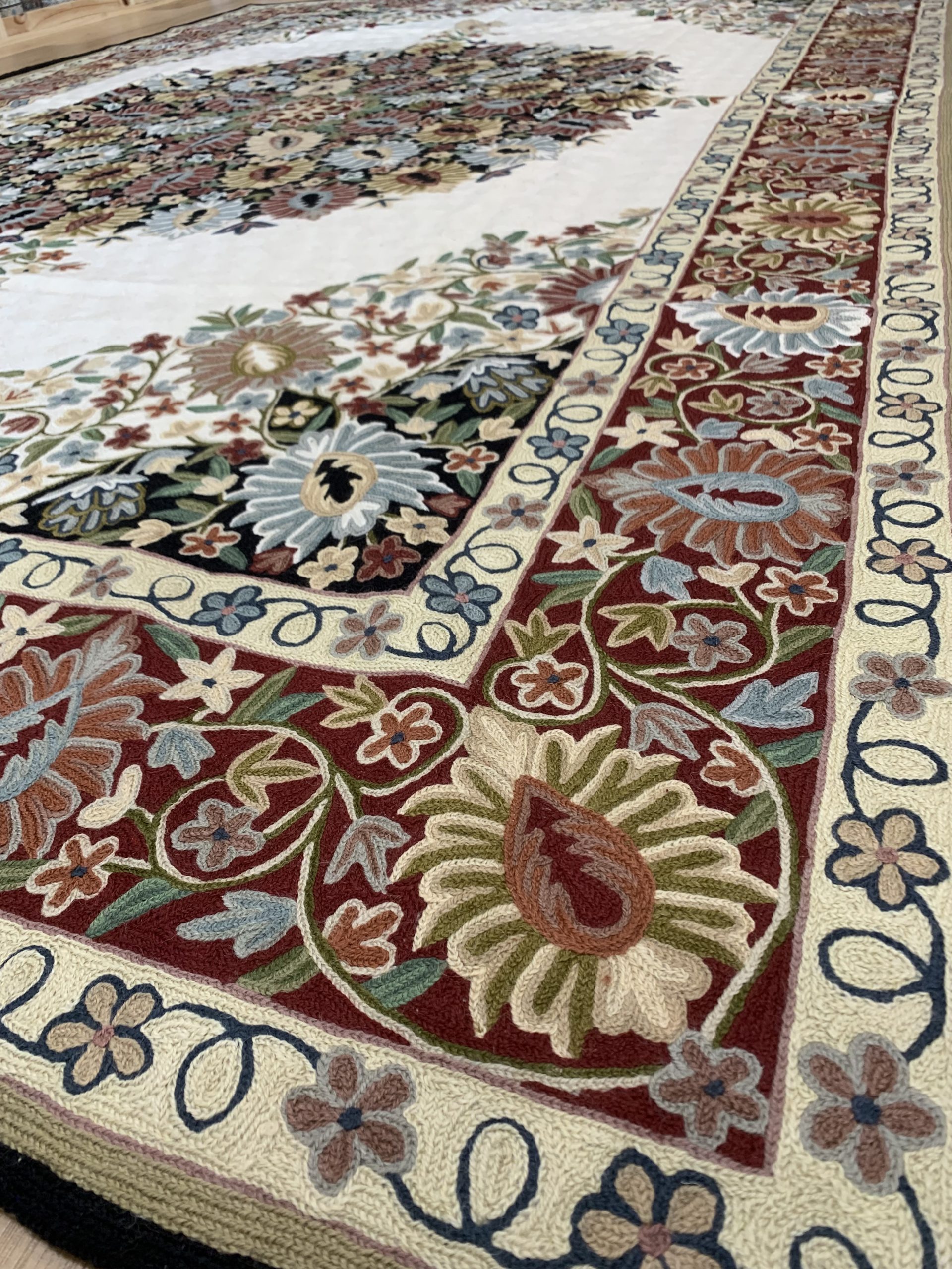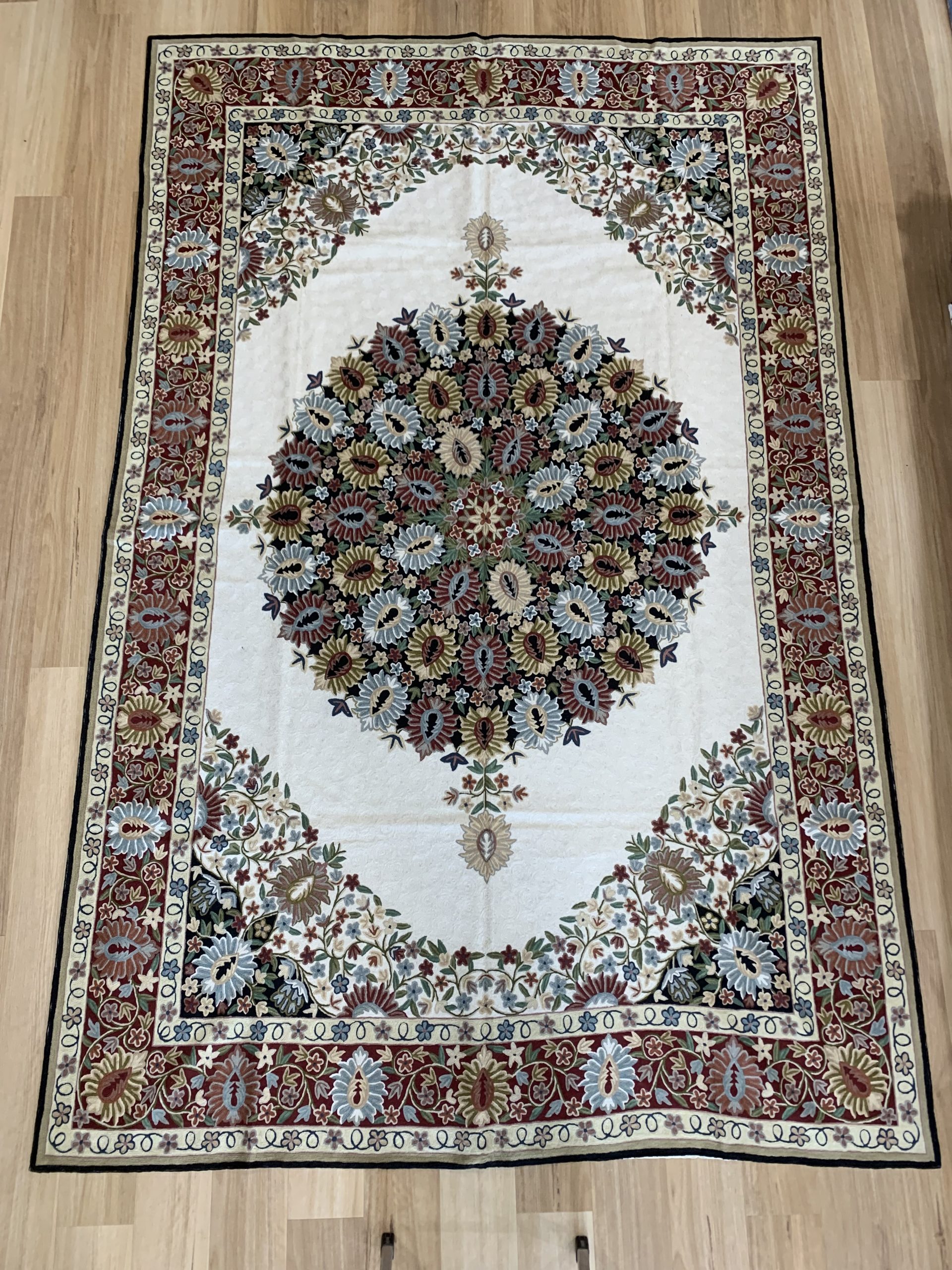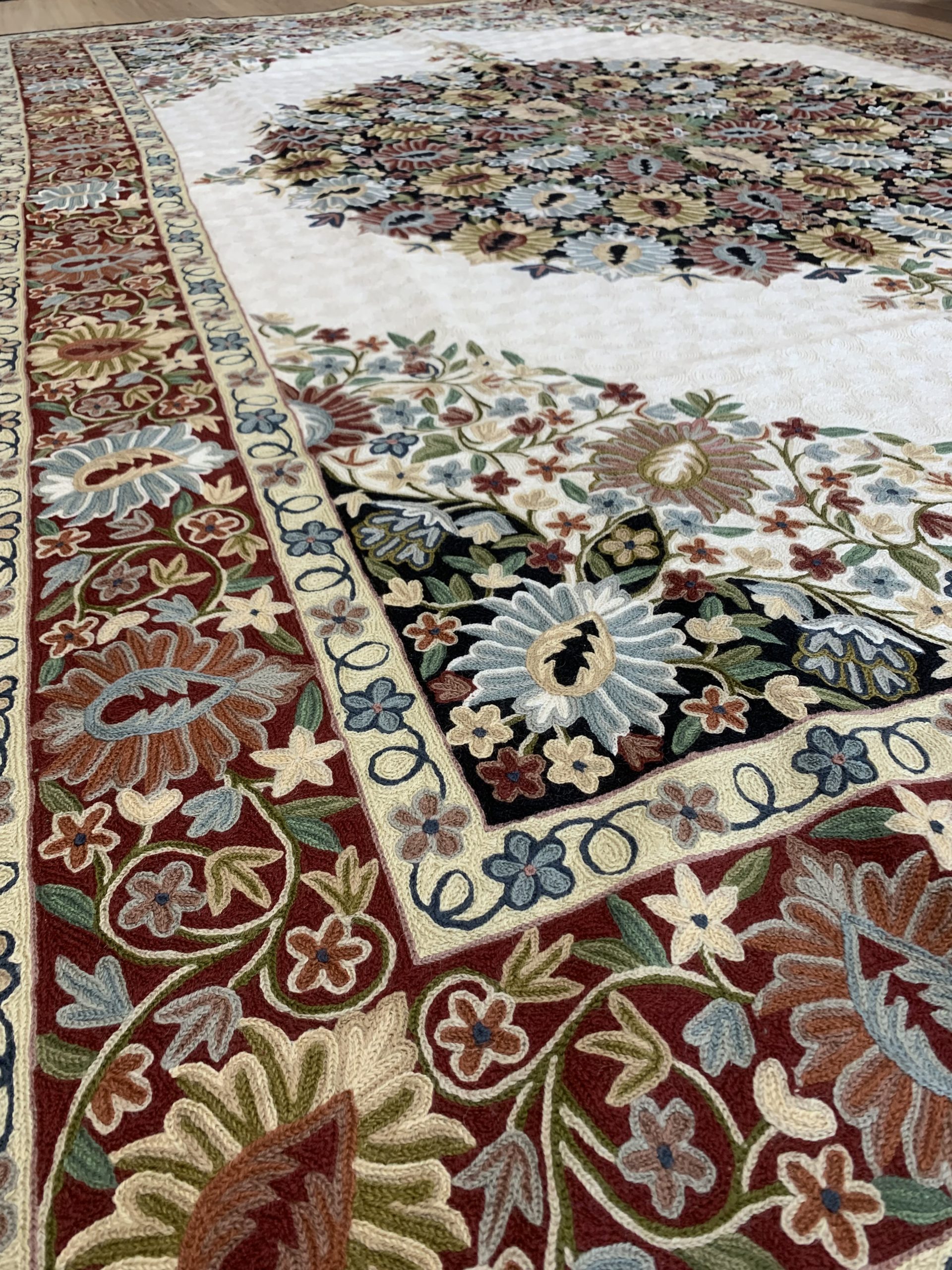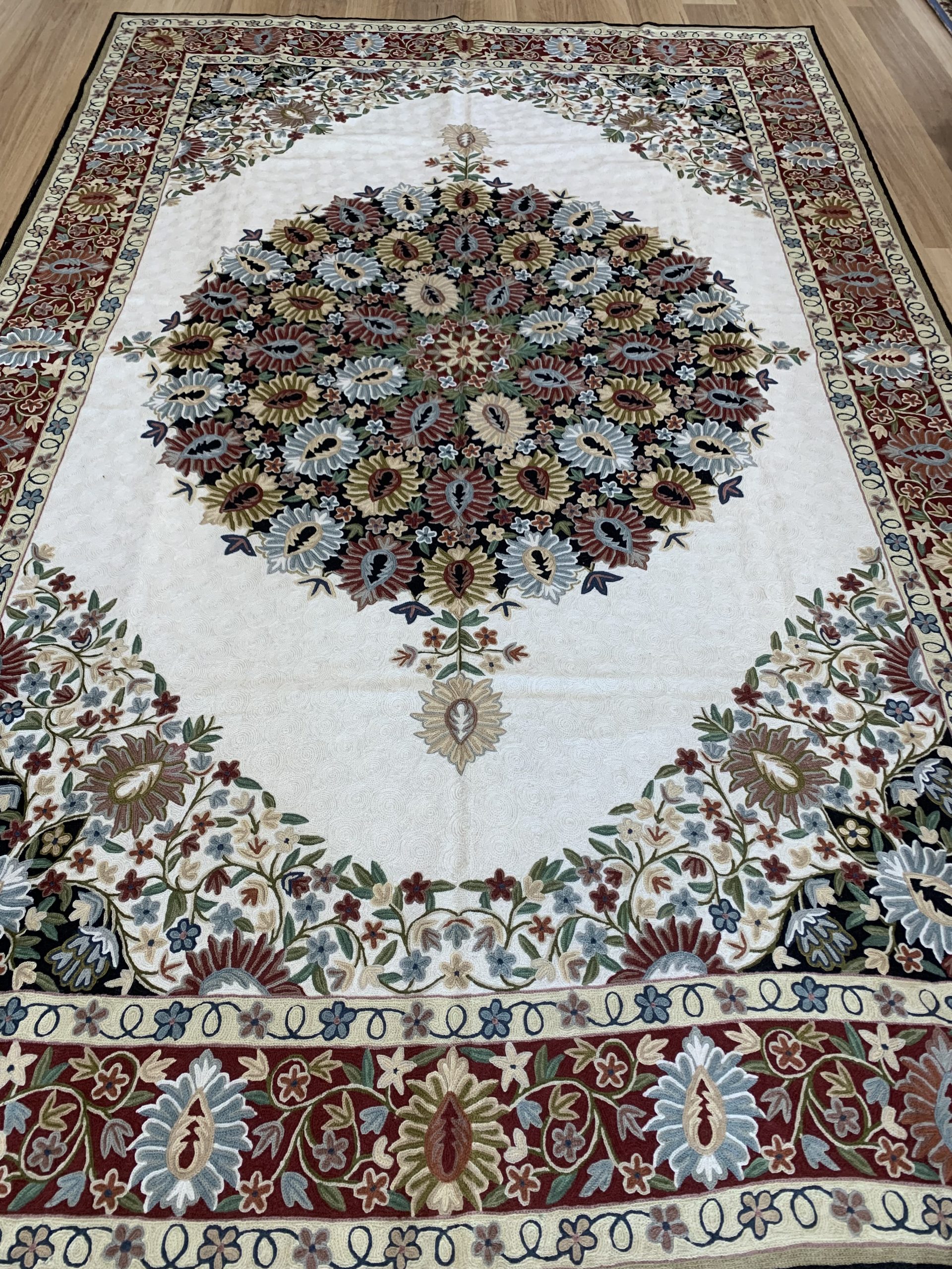 Incredible Chain Stitch Wool Rug 277×180 cm, Kashmiri Floral Design